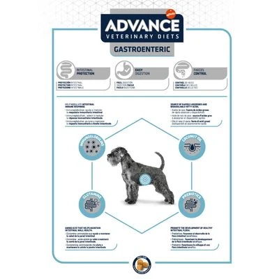 Advance Gastroenteric Veterinary Diets es un pienso completo dietético para cachorros y perros adultos con problemas digestivos o trastornos agudos de absorción intestinal o insuficiencia pancreática exocrina. Destaca por su contenido reducido de grasa y niveles más altos de sodio y potasio. Contiene ingredientes altamente digeribles como arroz y ácidos grasos procedentes del aceite de coco. Los prebióticos pueden favorecer el equilibrio de la flora intestinal. Proporciona todos los nutrientes y las sustancias vitales importantes.