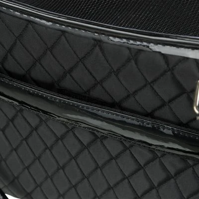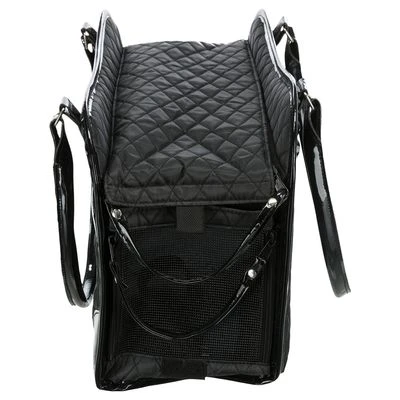 Bolso para perros pequeños de hasta 5 kg, con revestimiento acolchado y cuero sintético. Correa corta integrada. Con dos accesos, malla superior cubrible, y práctico bolsillo exterior. Color: negro