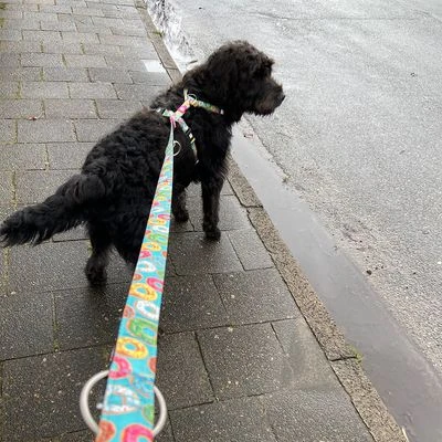 Correa para perros, multiples ajustes, con anillas semicirculares y mosquetones robustos, resistente estructura de doble capa con acolchado, de neopreno y poliéster. Diseño de donuts de colores.