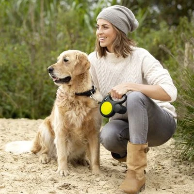 Correa extensible y automática para perros, de color negro e intenso amarillo neón, que unido a los elementos reflectantes aumenta la visibilidad y la seguridad. Con con cinta de 5 metros.