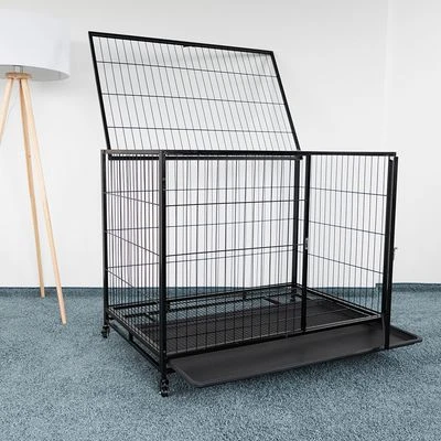 Jaula para perros de máximo 50 kg, para uso en interior, 4 ruedas giratorias, puerta frontal, techo abatible, bandeja inferior extraíble, rejilla de acero, de metal y plástico
