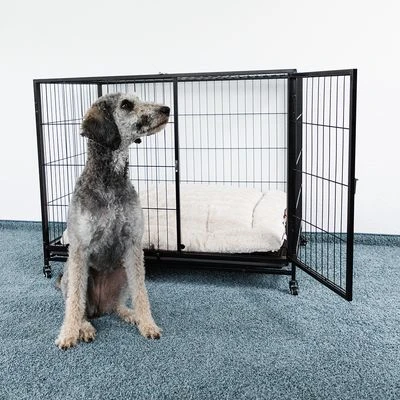 La jaula de interior HAFENBANDE Cabin está hecha de malla de acero resistente y fácil de manipular gracias a las ruedas giratorias. Es apta para perros de hasta 50 kg. Tiene una gran puerta delantera y el techo es abatible. Además, la bandeja inferior está hecha de plástico higiénico y se puede quitar. Esto facilita la limpieza.