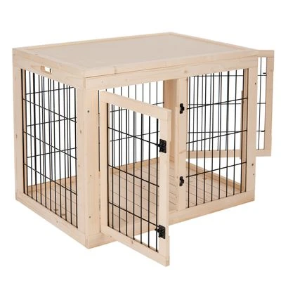 Jaula para alojar perros provisionalmente y seguros, color madera natural, dos entradas, robustas puertas de reja con cierres metálicos, suelo extraíble, techo robusto, de madera con reja de hierro
