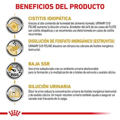 Royal Canin Veterinary Feline Urinary S/O es un alimento húmedo para gatos que ayuda a disolver los cálculos de estruvita. Se caracteriza por tener propiedades acidificantes de la orina, favoreciendo un entorno urinario desfavorable para los cálculos de estruvita y contribuyendo a la disolución de los existentes. Es bajo en magnesio, lo que reduce la concentración del componente de los cálculos de estruvita en la orina.