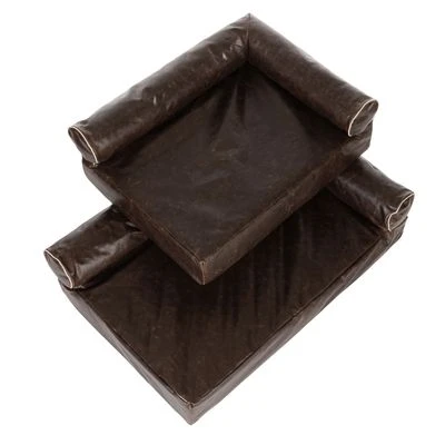 El brazo alto, cosido a dos lados de la cama, favorece la comodidad del perro debido a su forma estable. En él podrá apoyar cómodamente la columna y la cabeza. La superficie de apoyo lisa, hecha de piel artificial marrón, es especialmente flexible y tiene un aspecto antiguo gracias a su estructura veteada. El tipo de piel artificial es inodora de modo natural y ofrece protección optima frente a ácaros y pulgas.