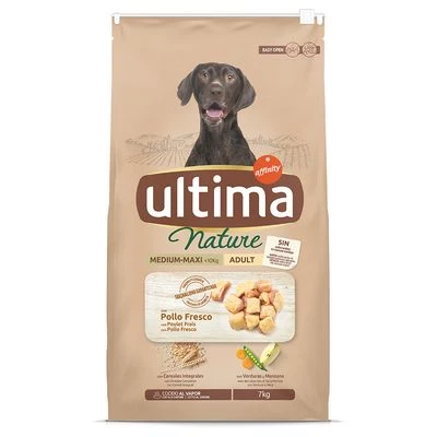 Ultima Nature Medium-Maxi con pollo es un pienso completo para perros adultos. Su receta está adaptada a lasnecesidades de los perros de razas medianas y grandes. Contiene delicioso pollo de corral, acompañado con ingredientes seleccionados como guisantes, zanahorias y manzanas. Esta composición tan completa da como resultado una comida equilibrada con las vitaminas y los minerales importantes, adecuada como alimento para el día a día.
